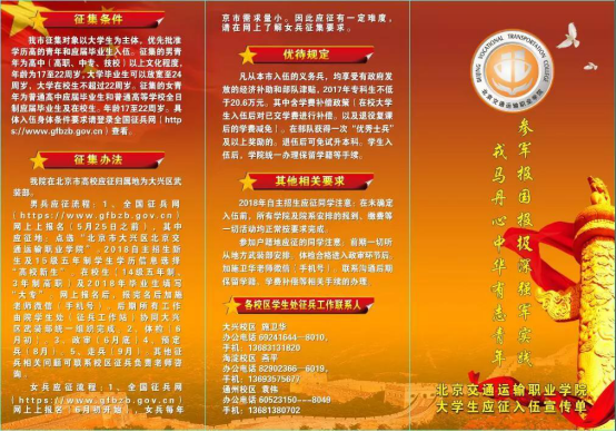 為了響應國家大學生征兵工作的號召,深入貫徹落實2018年全國及北京市大學生征兵工作會議的精神,同時鞏固我院征兵業務成果,切實做好2018年大學生入伍工作,激發我院學子的家國情懷,營造濃厚的校園征兵氛圍,自3月底開始,截止5月底,學院學生處征兵辦公室積極組織征兵報名工作,通過印發宣傳單、制作宣傳海報等讓學生充分了解征兵政策,確保征兵任務圓滿完成。