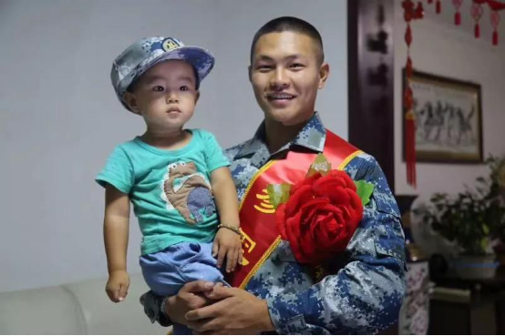 身穿迷彩軍裝,胸佩大紅花