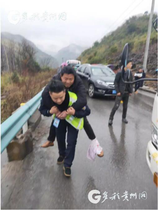 1月8日下午15:37分許,普定縣公安局交警大隊接縣局指揮中心指令:該縣補郎鄉018縣道15KM路段發生一起三車碰撞的交通事故,有人受傷。警情就是命令,接到指令后,事故中隊羅仕興帶領值班人員立即趕赴現場。在對現場進行勘查中,輔警夏凡發現事故中一輛三輪車車門已經被撞變形無法打開,駕駛人杜某雙腳被卡在駕駛室內,不能動彈。為及時將傷者救出,夏凡不顧破碎的擋風玻璃會劃傷自己,竭盡全力將傷者從駕駛室抱出,并背到警車上,在進行簡單的包扎處理后,隨后用警車將其送往醫院進行救治。