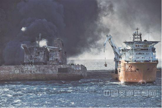 1月6日晚,巴拿馬籍油船“桑吉”輪滿載凝析油與中國香港籍散貨船“長峰水晶”輪在東海海域發生碰撞,“桑吉”輪爆燃。我國政府高度重視,交通運輸部所屬海事、救撈等專業力量迅速開展人命救援和污染防控,并遵循國際海事組織基本規則,第一時間協調伊朗、巴拿馬和中國香港等相關實質利益方組成聯合調查組。13日上午,上海打撈局“桑吉”輪碰撞燃爆事故應急處置小分隊徐軍林、徐震濤、盧平、馮亞軍冒著濃煙和爆炸危險,進入駕駛臺,找回VDR設備(黑匣子)及兩具遇難者遺體。14日,“桑吉”輪全船劇烈燃燒后沉沒。