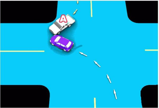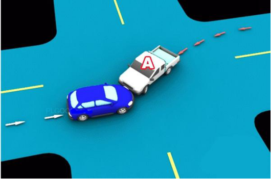 3、通過沒有交通信號燈控制的路口時,遇相對方向來車,左轉彎車未讓直行車先行的,圖中所示為A車負全責。