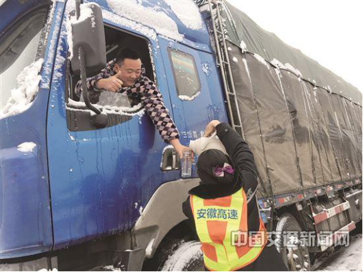 安徽省交通控股集團工作人員為過往貨車司機送熱水。特約記者 金海礁 攝