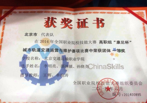 (3)2013年全國職業院校技能大賽高職組“城市軌道交通運營與維護”賽項二等獎;