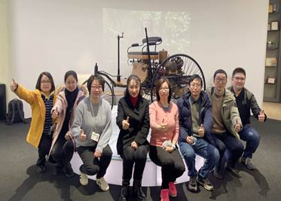 教師在奔馳“世界第一輛汽車”模型前合影 行指委信息化教學比賽獲獎
