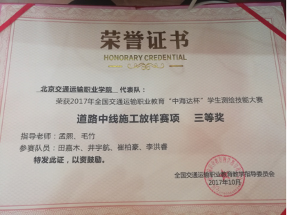 在本次技能大賽中,北京交通運(yùn)輸職業(yè)學(xué)院道橋系首次參加了本賽項(xiàng)。獲獎(jiǎng)比例分別為:一等獎(jiǎng)10%,二等獎(jiǎng)20%,三等獎(jiǎng)30%。在來自42個(gè)高中職院校,73個(gè)代表隊(duì)中,經(jīng)過激烈比拼,最終我院參賽隊(duì)榮獲了高職組電子測距法道路中線放樣項(xiàng)目三等獎(jiǎng)。