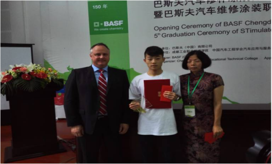 丁琪(中),2015年巴斯夫項目首屆全國優(yōu)秀畢業(yè)生技能比賽冠軍,目前在廊坊燕寶寶馬汽車服務有限公司工作。