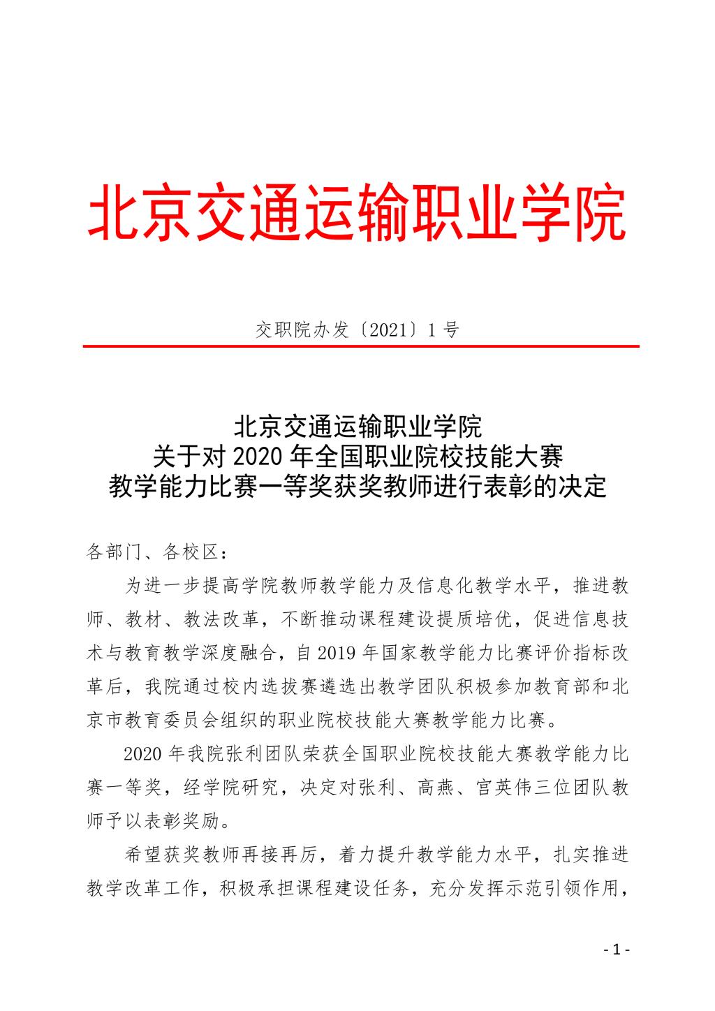 交職院辦發(fā)〔2021〕1號 關(guān)于對2020年全國職業(yè)院校技能大賽教學(xué)能力比賽一等獎獲獎教師進(jìn)行表彰的決定