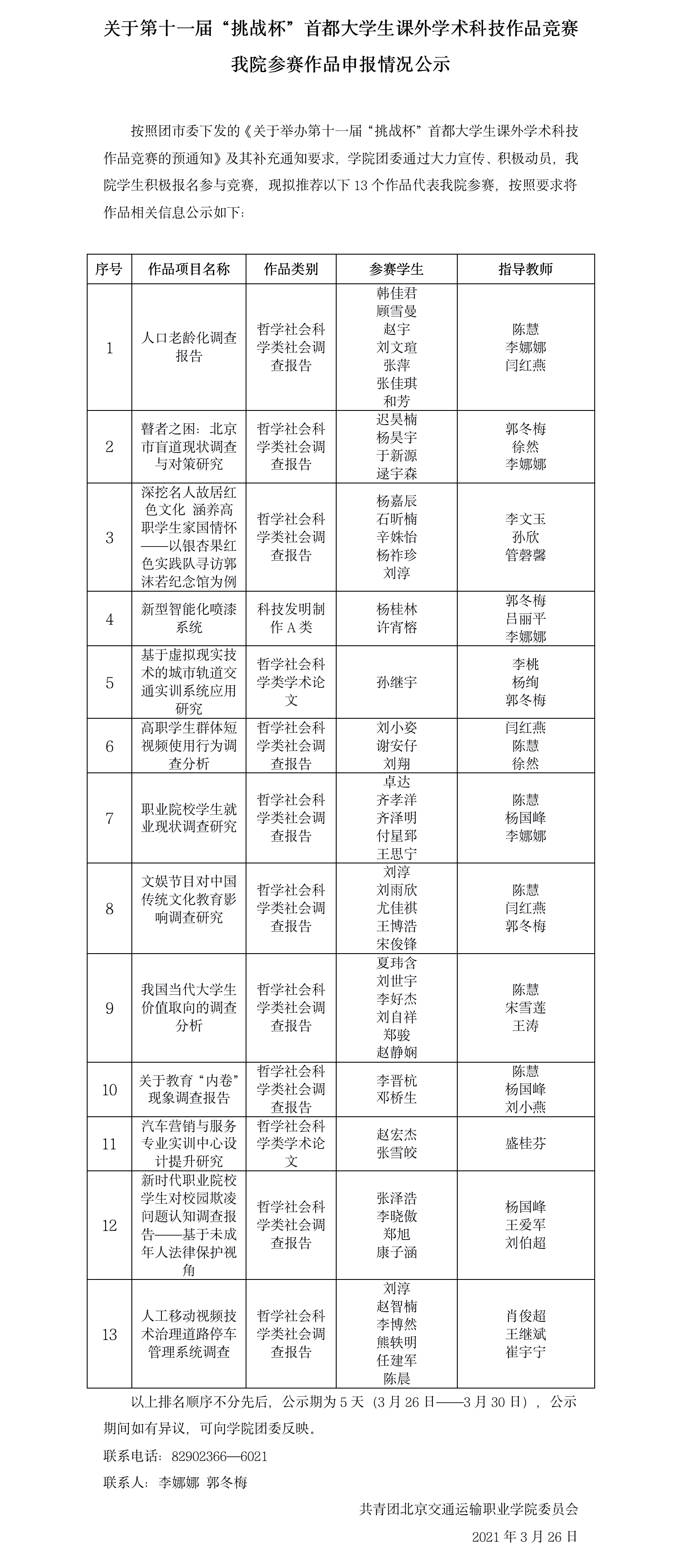 【團委】關于第十一屆“挑戰(zhàn)杯”首都大學生課外學術科技作品競賽我院參賽作品申報情況公示