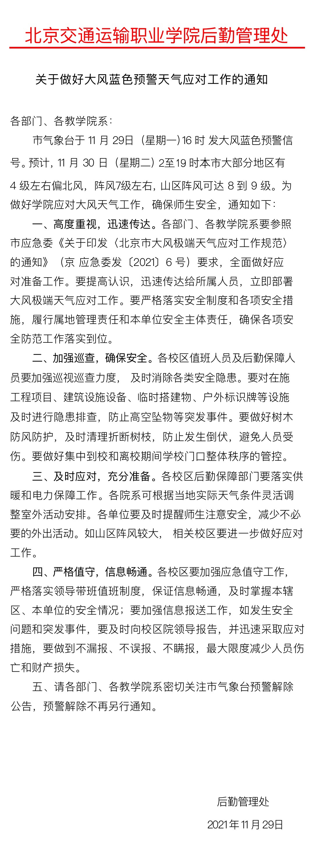 關于做好大風藍色預警天氣應對工作的通知(2021-11-29)