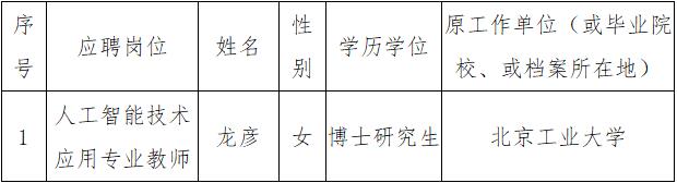 根據《北京市人力資源和社會保障局關于完善事業單位進人機制有關問題的通知》《北京交通運輸職業學院2022年人才引進工作實施方案》的有關規定,通過綜合考察、體檢、政審等程序,經學院黨委第三屆第16次會議研究決定,擬聘用龍彥同志為北京交通運輸職業學院人工智能技術應用專業教師,現將擬聘用人員情況予以公示。