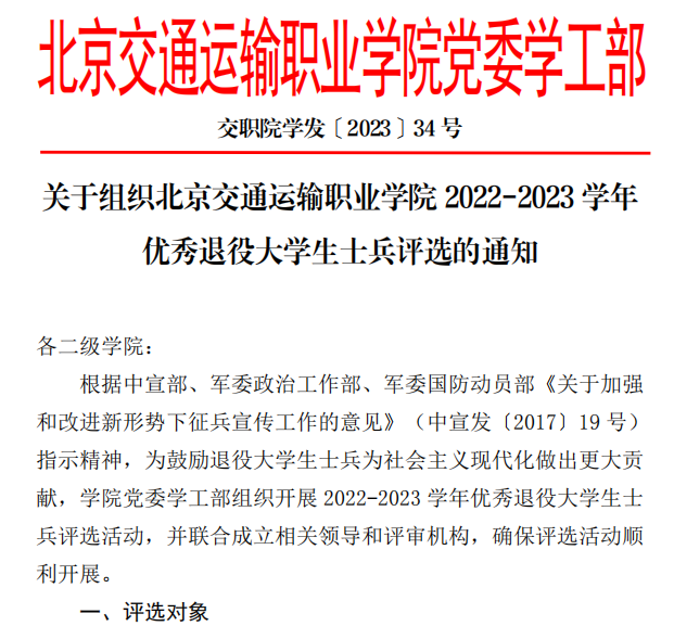 關于組織學院2022-2023學年優秀退役大學生士兵評選的通知