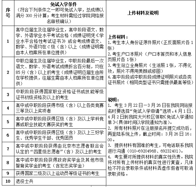 說明: 1. 考生3月22日--3月26日在我院網(wǎng)站報(bào)名時(shí)要選擇“非免試入學(xué)申請(qǐng)”選項(xiàng)。3月29日前獲得相應(yīng)文化課折算成績(jī)。 2. 所有材料照片及視頻在注冊(cè)報(bào)名并提交成功后,再登陸系統(tǒng)上傳,截止時(shí)間:3月26日16:00。 3. 提供材料有困難的考生,可電話聯(lián)系我院進(jìn)行溝通(010-69204968、69232401)。 4. 考生要對(duì)所提供材料的真實(shí)性負(fù)責(zé)。我院將對(duì)所有上傳材料的真實(shí)性進(jìn)行復(fù)查,凡體檢不符合錄取條件或材料弄虛作假者可取消錄取資格。 |