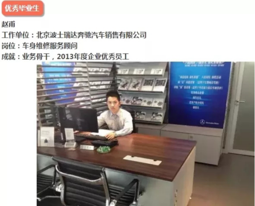 畢業(yè)生成為汽車后市場專業(yè)技術(shù)人員和銷售及售后服務(wù)人員的精英團隊,遍布北京中高端汽車品牌經(jīng)銷店,在汽車診斷與檢測、汽車銷售與服務(wù)管理、汽車鈑金與噴漆、汽車配件管理、汽車定損與評估領(lǐng)域發(fā)揮了骨干作用。