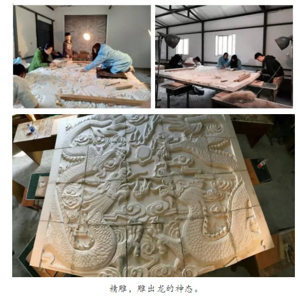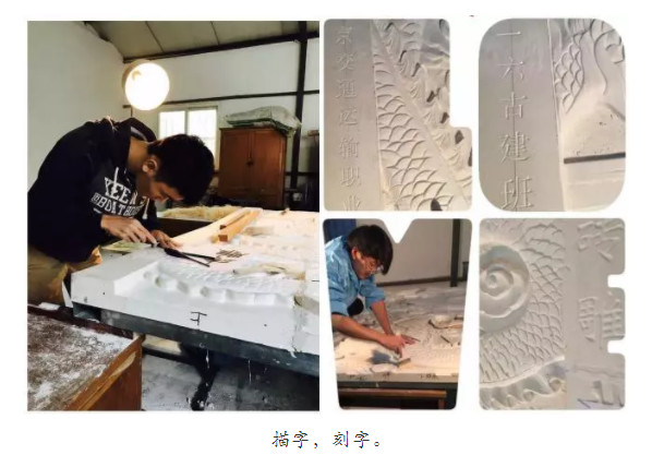 “二龍戲珠”為磚雕實訓的圖案藍本,建筑工程系16級學生在夏老師指導下還開展了磚雕實訓。實訓選用石膏板,每位同學負責一塊,最后再拼成完整圖案。同學們合理分工,按照各自的圖紙進行雕刻,有的甚至爬到石膏上去雕琢細節,希望能雕得更加傳神。