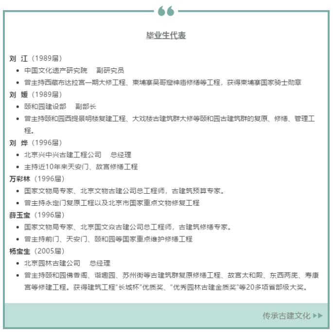 本專業為文物保護、古建筑等企事業單位,培養傳承中國古代建筑營造技術的緊缺專業人才,學生畢業后可在政府文物保護部門、古建筑設計單位、古建筑施工企業,從事工程管理、工程造價、古建筑與園林復原設計等工作。畢業生可沿著“項目管理員→專業工長→項目經理”的職業路徑發展。經過35年的發展,能夠在企業中成為管理與技術骨干,10--20年之后成為中國傳統建筑非物質文化遺產傳承人,直至成為古建行業骨干、專家。