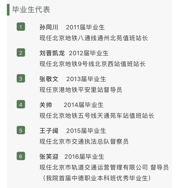 城市軌道交通專業群畢業生專業基礎扎實,動手能力強,職業發展空間大。畢業生就業崗位覆蓋北京地鐵運營有限公司、京港地鐵有限公司、北京市軌道交通運營管理有限公司、北京公交有軌電車有限公司等。專業就業率始終保持100%,對口就業率90%以上。