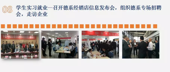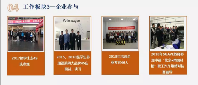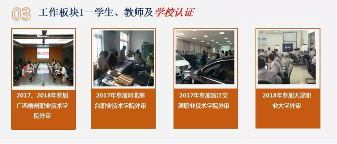 我院目前有9個SGAVE項目班級,共計258人,其中畢業生172人。我院獲得SGAVE認證資格的教師有9名,SGAVE項目師資培訓和考官培訓信息傳播者各有3名。我院共有8名審核員,數量位居全國首列。自SGAVE項目成立以來我院多次承辦SGAVE項目的會議、教師培訓和考官培訓工作。我院教師積極參加德國職業教育教學方法和德國五大汽車生產廠商的專業技術培訓,提高自身專業教學能力,為項目課程教學提供保證。