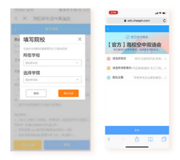(2)報名參會并完善信息。登錄成功后【報名參會】,填寫【學(xué)院信息】【選擇簡歷】【填寫求職意向】。