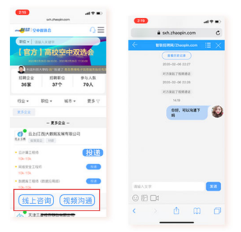 (3)查信息、投簡歷、上線溝通。瀏覽企業(yè)招聘信息【投遞】,活動開場后,可接收企業(yè)發(fā)起的文字/視頻溝通提示,可主動發(fā)起【在線溝通】【視頻溝通】,若企業(yè)不在線將收到短信提示。