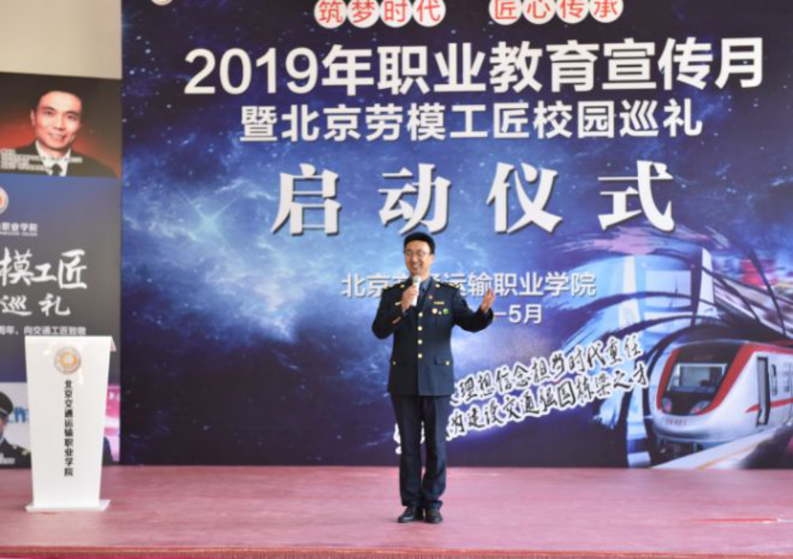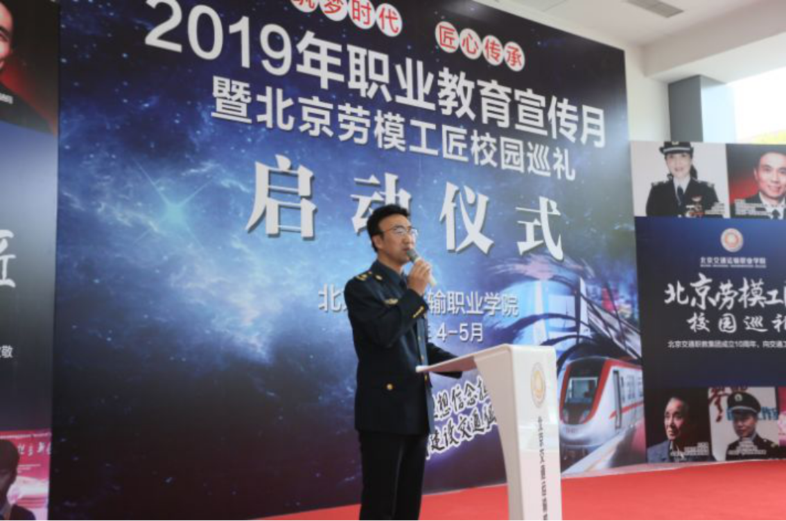4月25日,2019年職業教育宣傳月暨勞模工匠校園巡禮啟動儀式在學院海淀校區舉行,多名勞模工匠和技能大師出席活動,活動受到正在學院調研北京市交通職業人才培養工作的交通運輸部黨組成員、副部長劉小明一行領導的關注。北京交通宣講團的四名宣講員到場,北京市交通委員會順義公路分局李亮現場宣講自己扎根平凡崗位、服務百姓出行的優秀事跡,傳遞出堅守一線、甘于奉獻的勞模精神,打動了參與活動的領導和師生。