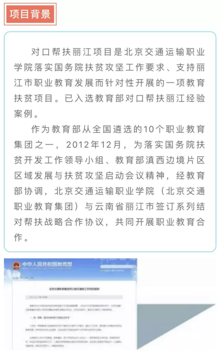 對(duì)口幫扶麗江項(xiàng)目以人才扶貧為主,重點(diǎn)開(kāi)展兩項(xiàng)幫扶工作:面向家庭貧困學(xué)生定向招生,提供來(lái)京接受免費(fèi)職業(yè)教育的機(jī)會(huì),幫助他們獲得職業(yè)發(fā)展機(jī)會(huì),帶動(dòng)家庭脫貧致富;面向?qū)趲头龅貐^(qū)職業(yè)學(xué)校的專業(yè)教師、校長(zhǎng)和管理人員開(kāi)辦培訓(xùn)班,幫助他們來(lái)京學(xué)習(xí)、掛職鍛煉,提升管理水平和開(kāi)展職業(yè)教育的能力。