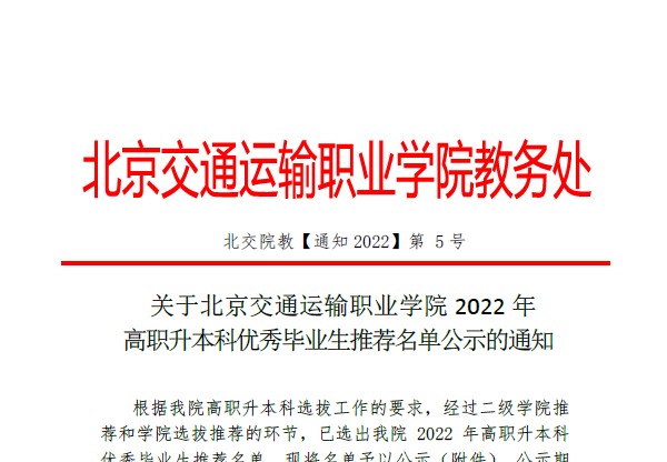 關(guān)于北京交通運輸職業(yè)學(xué)院2022年高職升本科優(yōu)秀畢業(yè)生推薦名單公示的通知
