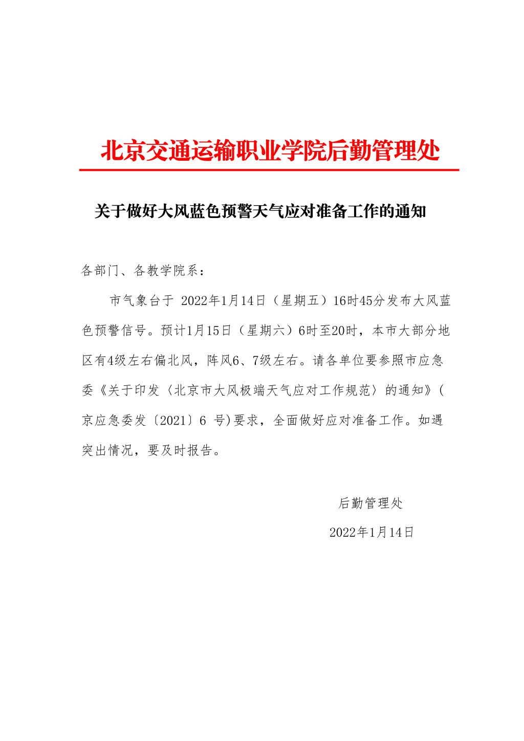 關于做好大風藍色預警天氣應對準備工作的通知20220114