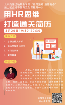 學院“春風送暖 “疫”路為你”線上就業指導系列直播課程第一講:“用HR思維打造通關簡歷”,可點擊鏈接https://app72yEx3nC2773.h5.xeknow.com/st/3ZJeovyjy或通過識別下圖中的二維碼進入直播回放。