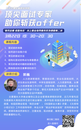 學院“春風送暖 “疫”路為你”線上就業指導系列直播課程第二講:“頂尖面試專家助你斬獲offer”可點擊鏈接https://app72yEx3nC2773.h5.xeknow.com/st/9vIcYmGJO或通過識別下圖中的二維碼進入直播回放。