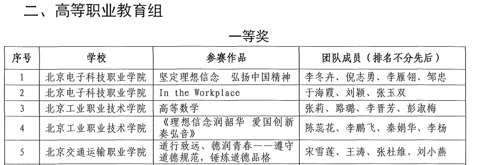 2022年10月,北京市職業院校技能大賽教學能力比賽順利結束,北京市教委發布《北京市教育委員會關于公布2022年北京市職業院校技能大賽教學能力比賽獲獎結果的通知》,北京交通運輸職業學院九支團隊全部獲獎,共獲得五個一等獎,四個二等獎。其中,思政部宋雪蓮教師團隊再次問鼎金獎,在此次比賽中榮獲高職“公共基礎組”一等獎。這已是思政部連續三年參加此項賽事并連續三年獲得一等獎且進入國賽選拔賽。