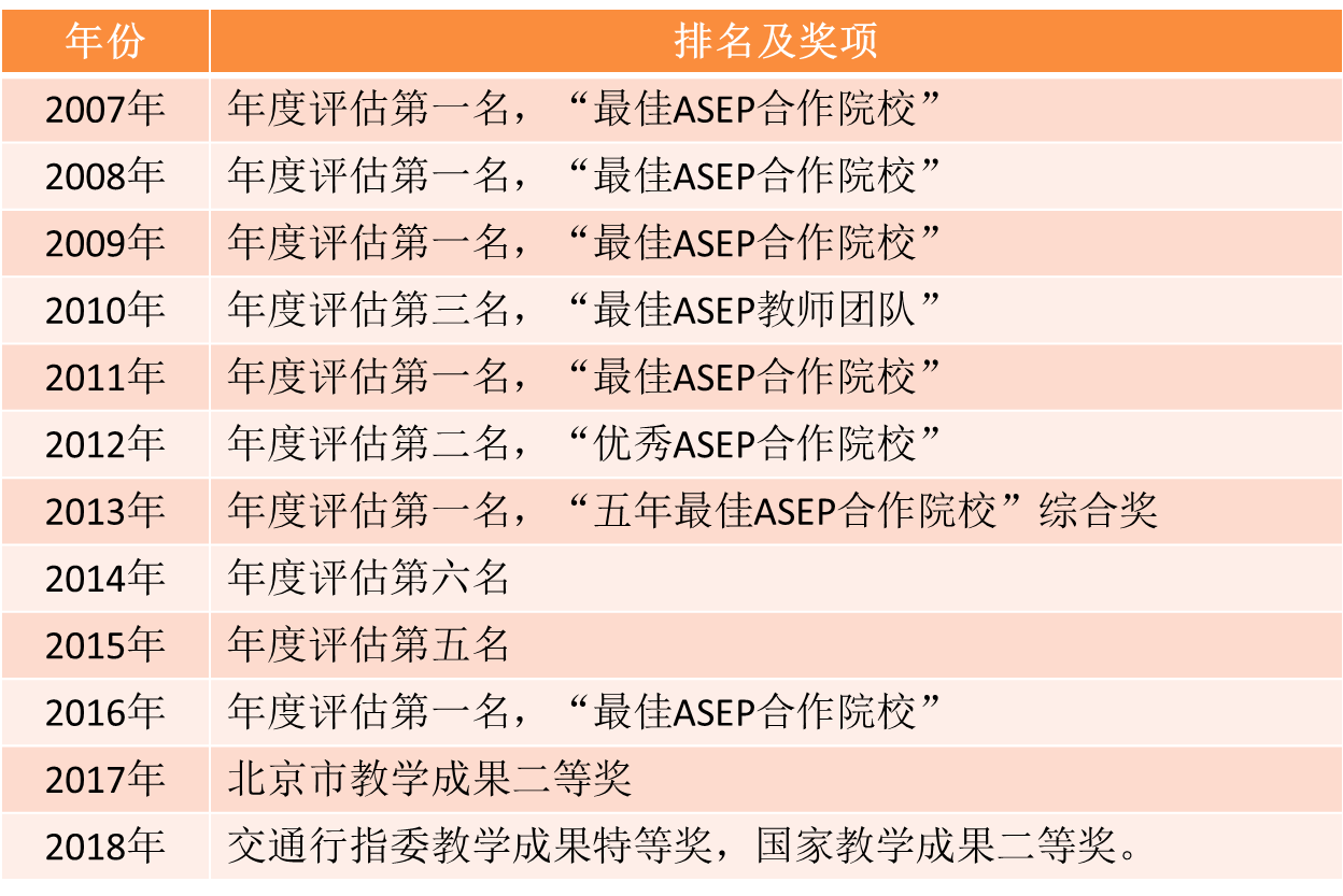 2006年至今,我院上汽通用ASEP項目教師團隊團結奮進,立足汽車職業教育,在培養一批又一批優秀學生的同時也獲得上汽通用有限公司、北京市教委、全國交通行業指導委員會等部門的嘉獎。