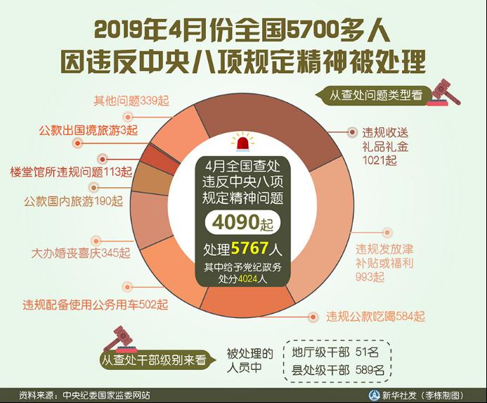 新華社北京5月27日電(記者朱基釵)中央紀委國家監委網站發布數據顯示,2019年4月全國查處違反中央八項規定精神問題4090起,處理5767人,其中給予黨紀政務處分4024人。