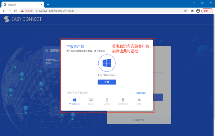 使用者通過瀏覽器(支持非IE瀏覽器)輸入IP地址:219.232.212.167,回車后會自動檢測使用電腦是否已經安裝了客戶端,如果沒有的話,就會彈出如下界面: