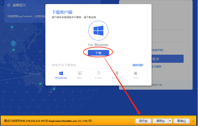 這里,不同的瀏覽器點擊下載后,彈出的對話框是不一樣的,目的就是下載客戶端并安裝。這里是以IE為例操作:點擊運行,彈出安裝界面:
