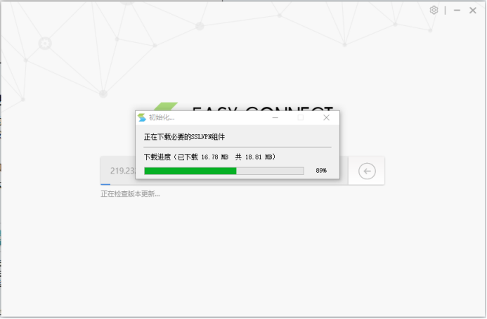 在『服務器地址』中輸入連接VPN 服務器的地址219.232.212.167,點擊→連接。第一次運行需要檢查客戶端,時間稍微有點長。此時可能出現如下對話框并提示下載更新: