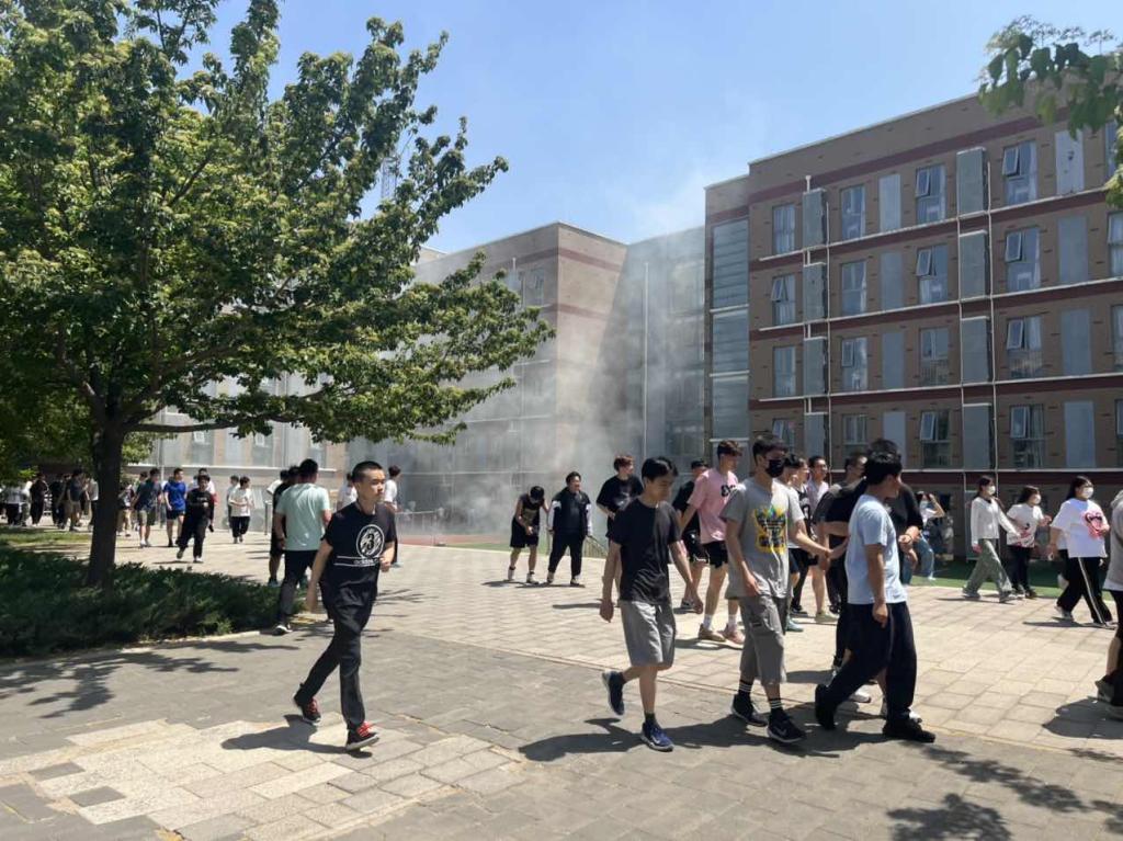 5月18日中午,隨著演練倒計(jì)時(shí)的一聲令下,校園公寓傳來陣陣濃煙,消防警鈴隨即響起,拉開了本學(xué)期應(yīng)急疏散演練的帷幕。