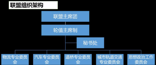設立聯盟主席團。聯盟最高權利機構,由聯盟成員單位各推薦一人(交通職教集團正副董事長或理事長,院校書記或院長)組成,負責領導聯盟各項工作,以主席團會議的形式對聯盟重大問題進行決策。