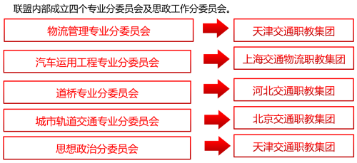 設立專業分委員會及思想政治工作分委員會。分別由天津交通職教集團、上海交通物流職教集團、河北省交通職教集團、北京交通職教集團和天津交通職教集團牽頭組建。各專業分委員會主任原則上由院級領導擔任。