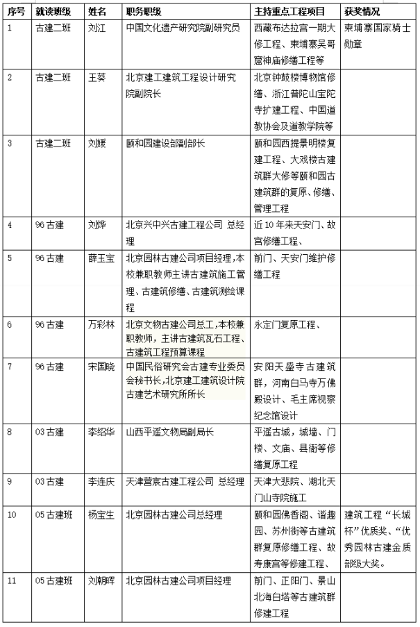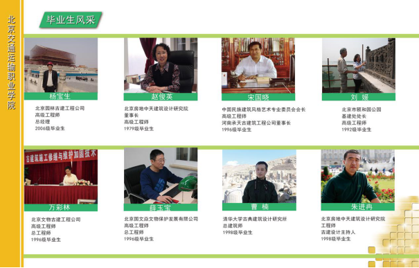 本校自1990年起該專業畢業生在古建筑行業起了越來越大的作用,歷經30多年的教學,如今的古建筑工程企業中,早期畢業生早已經成為企業骨干,國家各個重點工程項目中均能看到他們的身影,近幾年的畢業生也正在逐步的在行業中發揮著重要的作用。